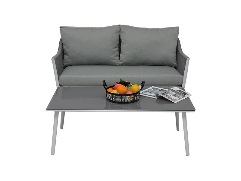 | Specificatie | aluminium frame met geweven touw, 4 stuks in totaal; loveseat: L75*B135*H76cm, 1PC enkele stoel: L75*B75*H76cm, 2PCS salontafel: L114*B60*H38.5cm, 5mm gehard grijs glas, 1PC |
