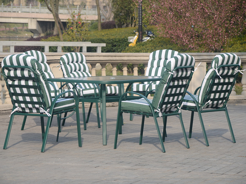 | 1tafel, 6stoelen; Tafel: 152 x 96 x 72 cm, stalen buis, 5 mm gehard rimpelglas, gegalvaniseerde schroef; stoel: 71×57×91CM, stalen buis, kussen van 10 cm met vezelvulling aan de binnenkant | 154×7×98cm/elke tafel in een doos; 25 stuks stoelen/pallet | 110SETS |