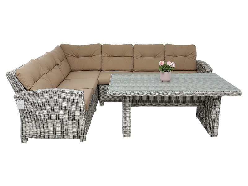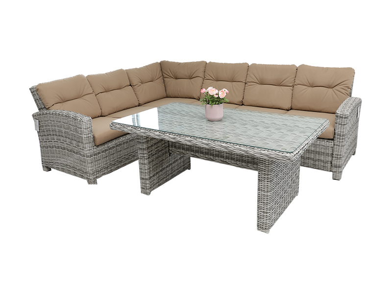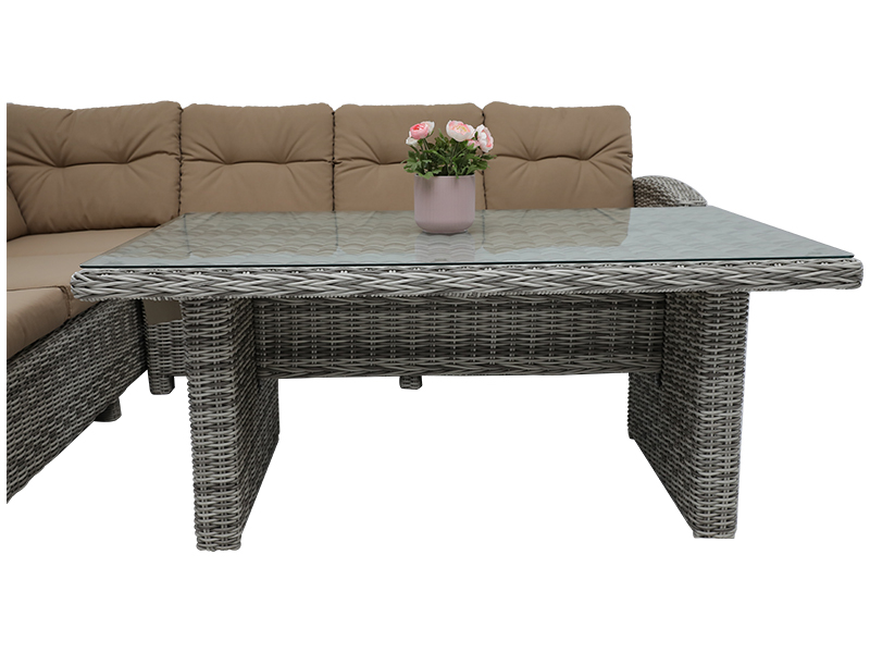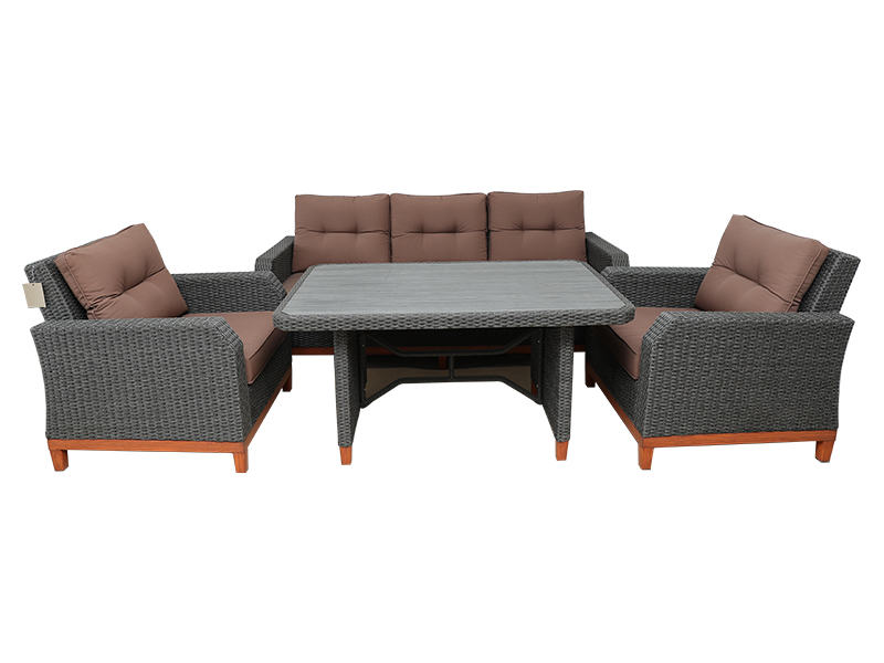 Aluminium buis Halve ronde Pe rattan, 10 cm zitkussen met spons binnen en 10 cm rugkussen met vezelvulling binnen, 230G stof; Driezitterstoel: L80*W190*H77CM, 1 st; enkele armleuning 3-zits stoel: L80*W160*H77CM, Amrest is kd, 1pc; Tabel: L140*W80*H63cm, 5 mm gehard helder glas, KD, 1 pcc | 142.5*18*83cm/één tabel in een doos; 192*99*83cm/anderen in een doos | 36Sets |